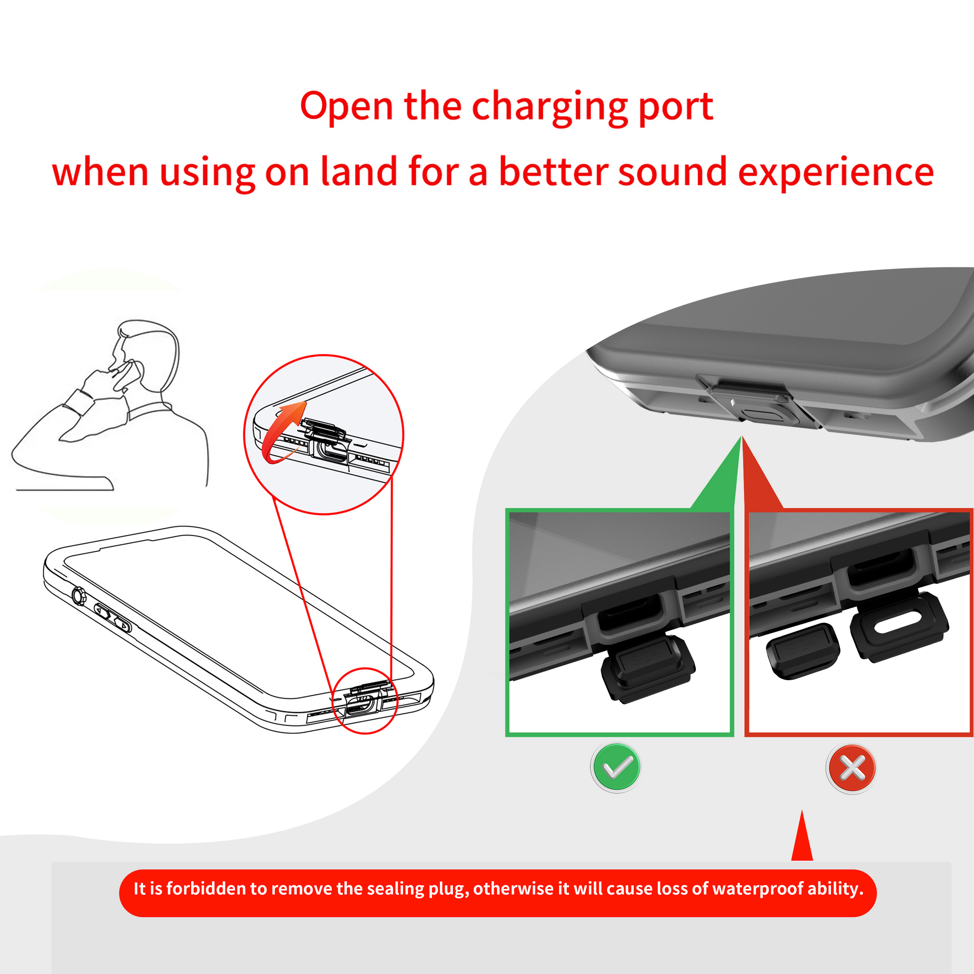 3. When not in contact with water and used on land, opening the charging port cover can provide a better sound experience.